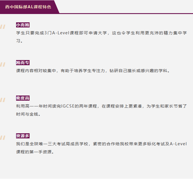 西安中学国际部A-Level课程班是由英国剑桥大学国际考试委员会(CAIE),英国资格评估和认证联合会(即国家考试局AQA)和英国爱德思国家学历与学术考试机构(Edexcel)与西安中学联合开办,是陕西省唯一一家可提供中国境内全部三家考试局认可的国际班,为学生提供多元化课程体系及升学路径。目前开设基础数学(包括纯数、概率统计、机械学)、高数、物理、商科、经济学、化学、中文、生物、计算机科学等课程。
