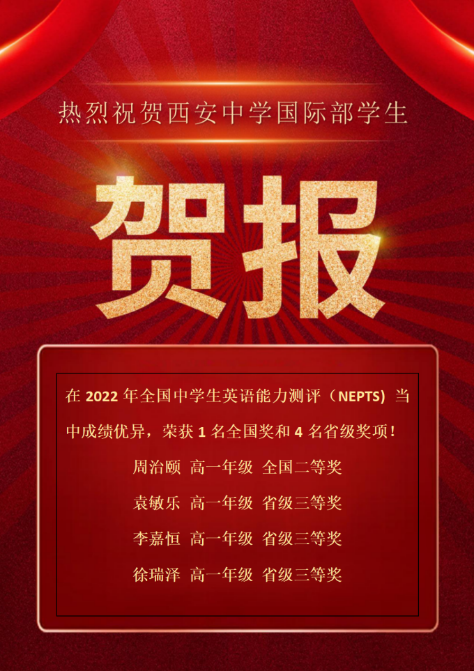 全国中学生英语能力测评(NEPTS),被誉为我国中学生英语 “奥赛”,得到各地中学、教育教研部门和单位的积极支持和广泛参与。近日,2022年全国中学生英语能力测评( NEPTS)获奖结果正式揭晓,在西安中学国际部学子和老师的共同努力下,我校国际部去年参赛的学生均取得了喜人成绩!获得全国二等奖1人,省级三等奖3人。特向全体师生报喜: