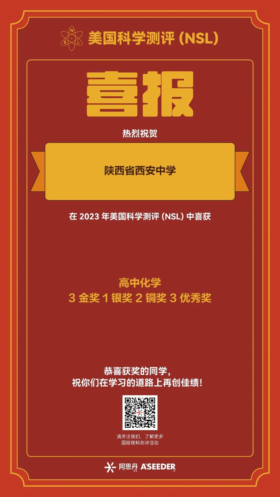 2023年3月16日,“2023年美国科学测评( NSL )” 在线上及合作学校同时进行。恭喜西安中学国际部同学们在本次NSL竞赛中斩获金奖3名,银奖1名,优秀奖3名的优异成绩!