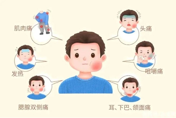 大多数患儿最早出现耳下肿大和疼痛的症状,通常为一侧或两侧耳垂根部肿大,肿大的腮腺常呈半球形,以耳垂为中心,向前向下向后弥漫性肿胀,并有明显的压痛。在咀嚼或进食酸性食物时,疼痛加重。少数患儿在腮腺肿大1-2天前可出现发热、头痛、无力、食欲缺乏等全身不适症状,继而出现腮腺受累肿大,颌下腺或舌下腺亦可以受累,整个病程约1-2周。此外,病毒也可侵犯其他的腺体组织和器官,可伴有严重并发症,如脑膜炎、心肌炎、卵巢炎或睾丸炎等。