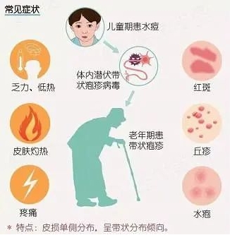 主要表现为分批次出现的皮肤粘膜的斑疹、丘疹、疱疹及结痂,可伴有发热、头痛、咽痛等上呼吸道症状。成人主要因潜伏于体内的病毒再次激活而患带状疱疹,临床特征主要是沿身体单侧感觉神经相应皮肤节段出现成续的疱疹,常伴局部神经痛。潜伏期一般为10-21天,平均14天。