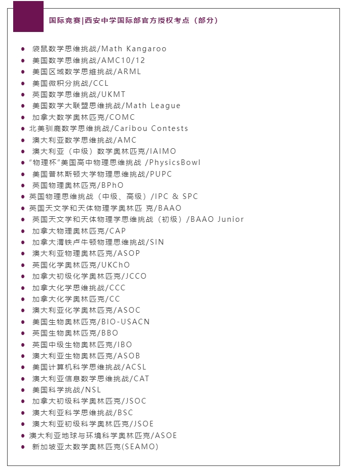 西安中学国际部将一如既往地为学生提供优质的教育资源和广阔的发展平台,结合不同年级的特点与要求,老师们会根据每位学生的个性和学习情况,未来升学目标、专业选择、个人兴趣等,制定个性化的教学方案,帮助他们找到自己的优势领域与竞赛方向。为学生们筛选适合不同学术水平的数学竞赛,并积极鼓励他们参加相应赛事,助力每一位学子实现自己的梦想。