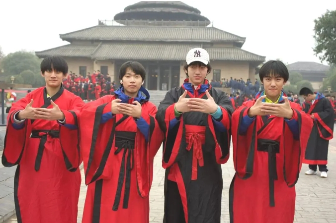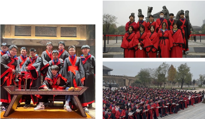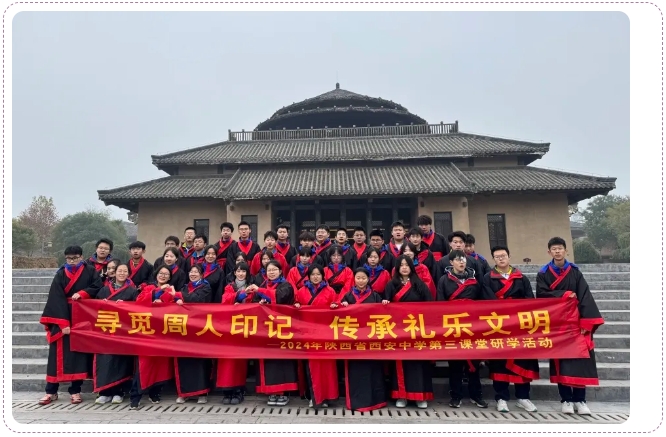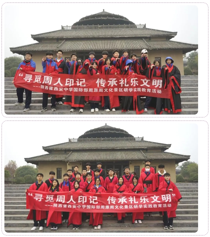 初到周原,师生们就享受到尊贵的迎宾礼,国际部学子着华服、观看周代迎宾礼,学拱手礼,颂《巍巍周公》,“昊昊元圣,巍巍周公。煌煌伟业,鼎鼎大名.......”声声朗诵一代元圣周公的丰功伟绩,感受中国传统礼乐文化的魅力和对古代先贤的缅怀和敬仰。
