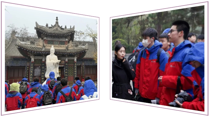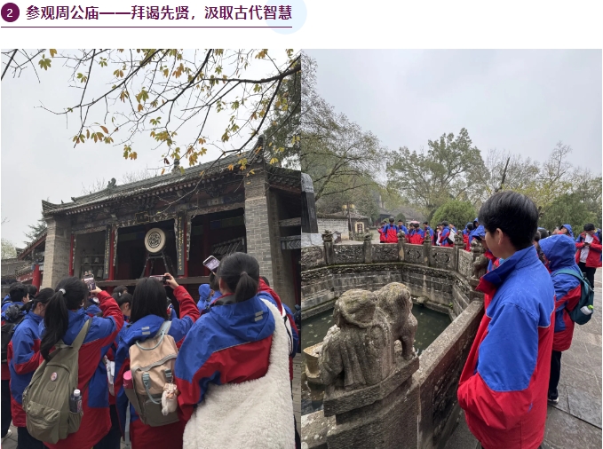 随后,同学们乘坐索道,到达山脚下的千年古庙,参观历代碑碣、汉唐古树、庙宇古建等,了解元圣周公制礼作乐一生的丰功伟绩,熟悉了周朝发展脉络,还了解周公庙的历史变迁及文化传承。大家通过周公开启的民本、德治、礼乐等思想,学习到了古代先贤的智慧,相信同学们也从中汲取到了许多宝贵的人生经验和力量。