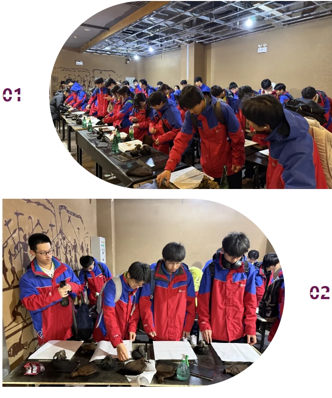 青铜器是璀璨周代文化的缩影,通过景区毛公鼎、何尊等青铜建筑以及各类周代青铜器现场展示教学,同学们亲手制作青铜器拓片,学习青铜历史知识和青铜器背后的故事和文化。