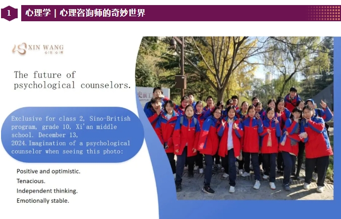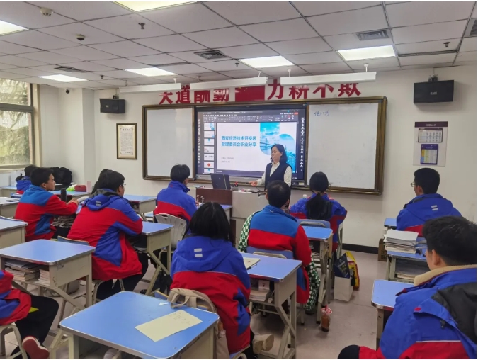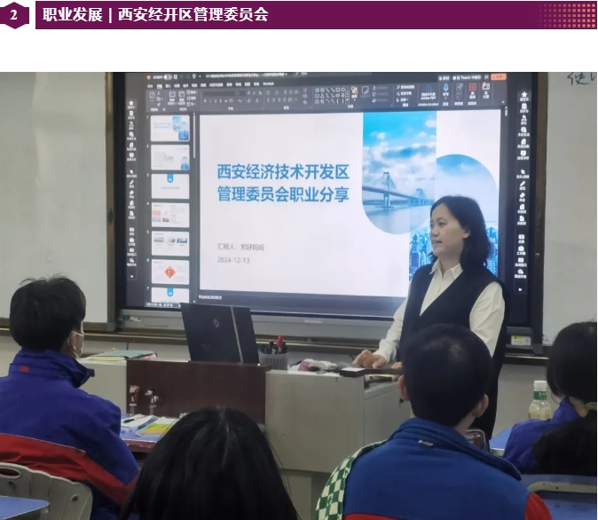 国际部中英班王曼霓同学的爸爸是一位资深的心理咨询师,讲座开始,王先生为大家播放了自己心理咨询室的工作日常,为大家介绍了心理咨询师的起源和发展趋势。 随后,王先生通过两个生动的小游戏“Straight Eyebrow Stick Game”和“Untie the Bracelet”带大家感受团队合作的重要性和心理学的魅力,同学们热情高涨,积极参与,并大胆表达自己组在游戏过程中遇到的问题及解决方案。 讲座过程中,王先生为全班每个学生家长赠送了书籍《父母的重塑》,希望家长们能了解孩子,读懂孩子,从而帮助家长们根据孩子的特点进行恰当的指导,给孩子真正想要的、适合的教育,做不焦虑的父母。 中日班郑好同学妈妈从自身工作角度出发为大家带来了西安经济技术开发区管理委员会的职业分享。通过对管理委员会职业岗位介绍、职业发展路径与晋升机会、工作环境与福利待遇、团队建设与企业文化、招聘流程与选拔标准几个方面,让大家深入了解到管委会的各个岗位职能。 讲座结束后,班主任为王先生和赵女士颁发职业生涯荣誉讲师聘书,也感谢参与和支持此次活动的家长讲师们,正是有了你们的热情投入,才使得这次分享会如此成功且意义非凡! 教育路上,任重而道远,国际部致力于培养全面发展的新时代人才。开展“家长职业课堂”系列活动,帮助学生了解职业相关信息,唤醒学生学习内驱力和未来成才的动力。让学生从实际,从即刻出发,确立人生目标,勇敢追梦。 我们也希望有更多的家长们走进课堂,关注孩子,关注学校发展,更好地发挥学校、家庭和社会为一体的教育功能,让我们一起走在家校共育的路上,静待花开!