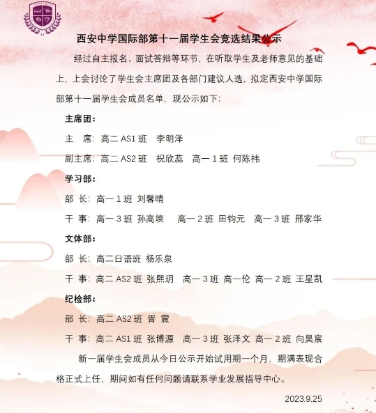 经过自主报名、材料审查、面试答辩等环节,现将西安中学国际部第十一届学生会成员名单公示如下: